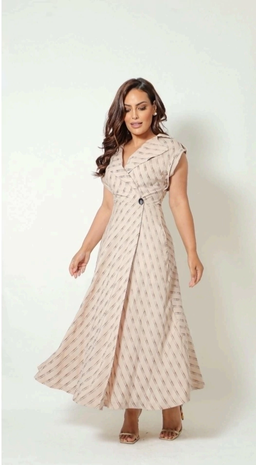 Vestido Joice, confeccionado em viscose bege com listras em tons terrosos. Máxi mídi transpassado com fechamento em um botão lateral, mangas muscle com martingale nos ombros, gola lapela, bolsos laterais funcionais e saia fluida dando movimento e leveza a peça. Vestido elegante e fresco ideal para ocasiões diurnas.